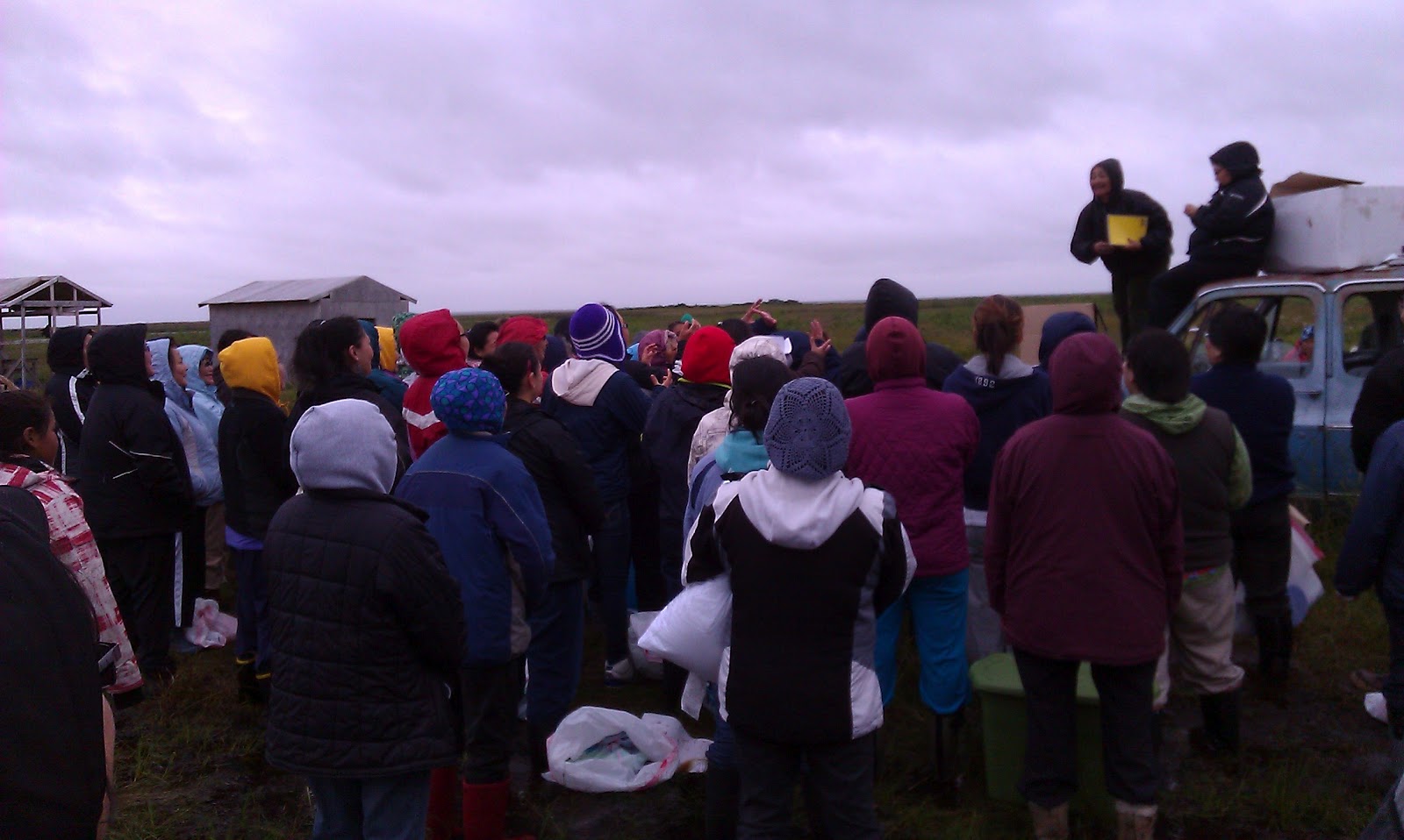 Throwing parties are a Yupik tradition that woman put on for various reasons. For example, when a child get's their first catch or kill they have a throwing party. The reason for this throwing party was a 1st birthday. At throwing parties the women crowd around houses, or in this case a junk car, and the people who are hosting this party begin throwing items to the crowd. Things like towels, laundry baskets, soap, even underwear were thrown. It was quite the interesting to see how the women would compete for each object. It was also terrifying to see huge objects being propelled through the air. I wasn't in the adventurous mood and just watched on the boardwalk. On a side note, if you're a male don't go to these. It's a very feminine practice, so boys and men are usually not present.